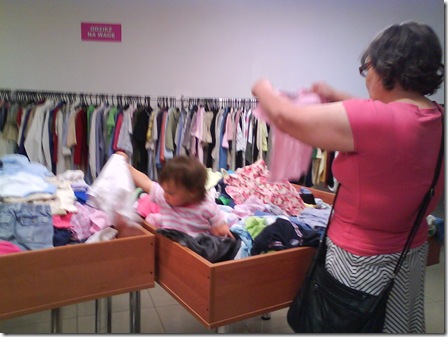 Myszoptica - no co Ty, ja nie z tych... Nie było takiego podziału, siedzi normalnie w boksie na wagę z rzeczami dla dzieci ;) Jakbym chciała zbić majątek mogłam wystawić w sąsiedniej sali w rzeczach wycenionych ;) Oczywiście Pszczola od stóp do głow odziana w ciucholandowe fatałaszki :)